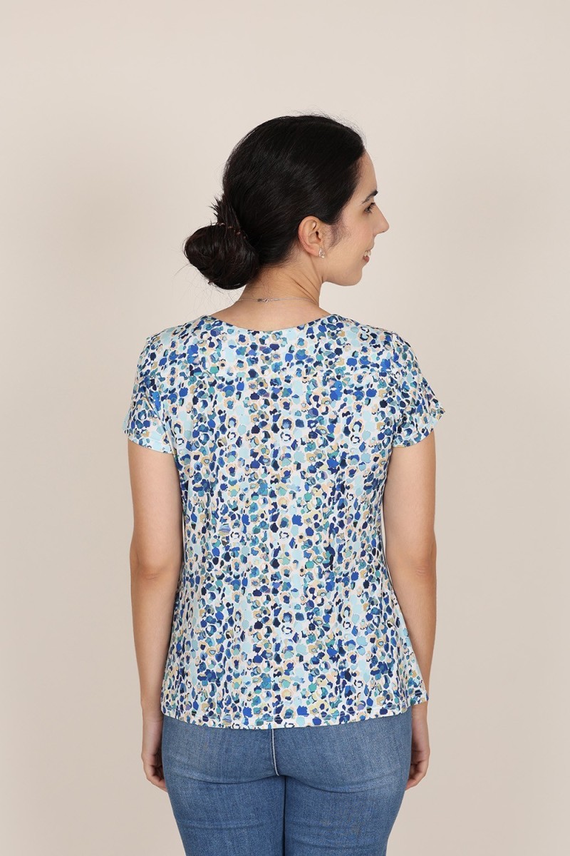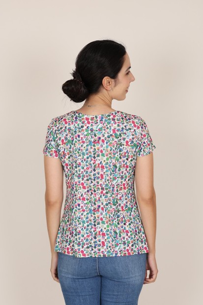 Printed t-shirt, very bright. Its crossed cut is very flattering and slims the silhouette. Ideal to coordinate with pants and skirt. A wild card in our closet.